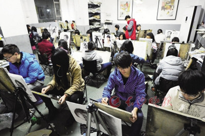 學(xué)習(xí)美術(shù)的肖婷告訴記者:“美術(shù)考試一般由三部分組成,分別是素描、速寫(xiě)和色彩??记巴粨舻目忌械耐ㄟ^(guò)默寫(xiě),將平時(shí)練習(xí)最多的某一類(lèi)畫(huà)的模樣照搬出來(lái)。一般畫(huà)室會(huì)將應(yīng)試技巧教給學(xué)生,考生便依照這樣的套路練上幾個(gè)月?!?/div>