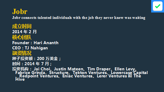 Coffee 和 Switch 同樣投資不明。以下是 Jobr 拿錢情況,它在成立 5 個(gè)月后拿了 200 萬美金的種子資金。