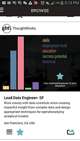 比如,我隨便選了個(gè)叫 Thoughtwork 的公司,點(diǎn)擊“喜歡”后,該公司招聘頁面突然變成評(píng)分圖,而評(píng)估匹配度的五大指標(biāo)是:Skill、Employment evel、Education、Success potential 和 Historical 等。