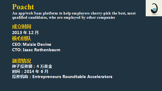 Poacht 對(duì)自己描述是:幫助雇主挑選那些正受雇于其他公司的最好和最有資格的候選人。它已完成種子投資,在成立半年后拿了 4 萬美金。