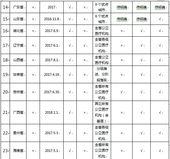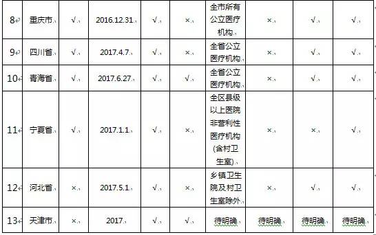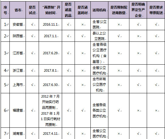 從2016年6月開始,各醫(yī)改試點與非試點省市均開始出臺“兩票制”的地方實施文件。政策要求在各省市均有些微差異,詳見下表: