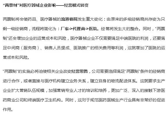 總體來看,兩票制落地促使醫(yī)療器械行業(yè)加速整合重組,促進醫(yī)藥產(chǎn)業(yè)健康發(fā)展。醫(yī)療器械行業(yè)必將迎來全新的發(fā)展模式,這給優(yōu)質(zhì)醫(yī)療器械企業(yè)帶來更多的發(fā)展機遇。