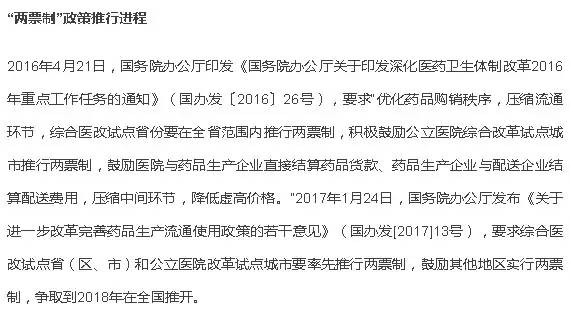 “兩票制”是指醫(yī)藥生產(chǎn)企業(yè)到醫(yī)藥流通企業(yè)開一次票,醫(yī)藥流通企業(yè)到醫(yī)療機構(gòu)開一次票,以“兩票”為標準壓縮流通環(huán)節(jié),提高流通效率的藥品流通體制。