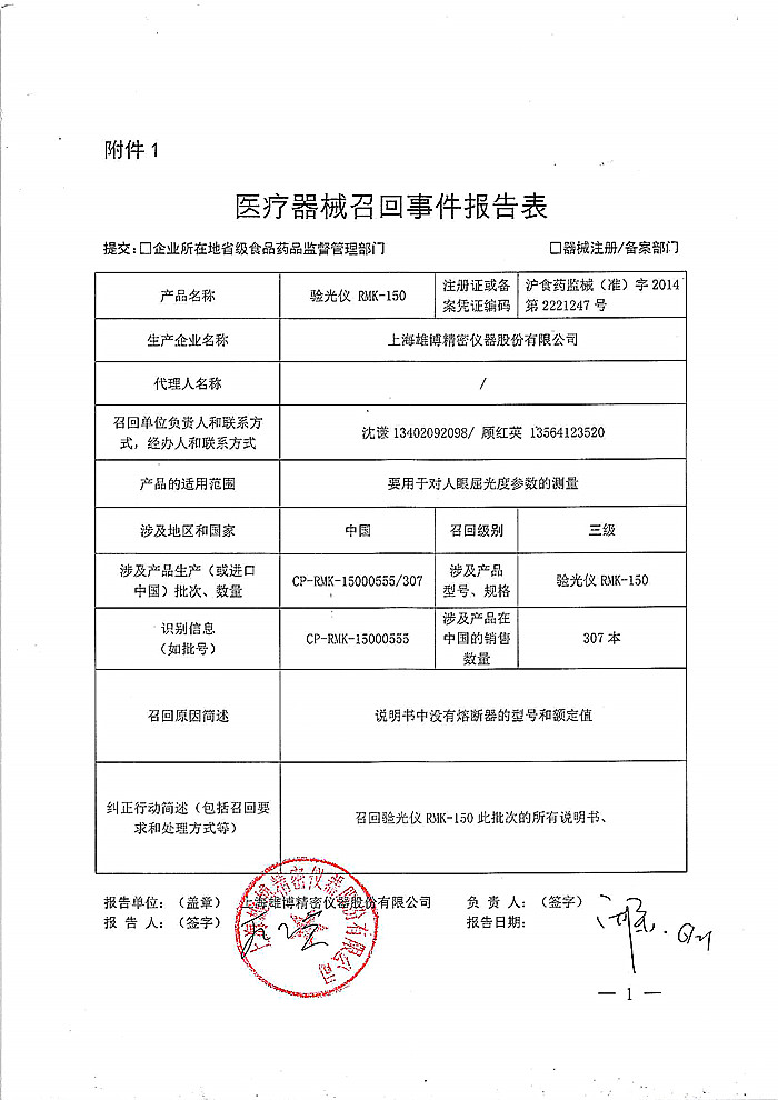 上海雄博精密儀器股份有限公司報(bào)告,涉及產(chǎn)品說明書中沒有熔斷器的型號(hào)和額定值。上海雄博精密儀器股份有限公司對(duì)驗(yàn)光儀(注冊(cè)號(hào):滬食藥監(jiān)械(準(zhǔn))2014第2221247號(hào))主動(dòng)召回。召回級(jí)別為三級(jí)。涉及產(chǎn)品的型號(hào)、規(guī)格及批次等詳細(xì)信息見《醫(yī)療器械召回事件報(bào)告表》。