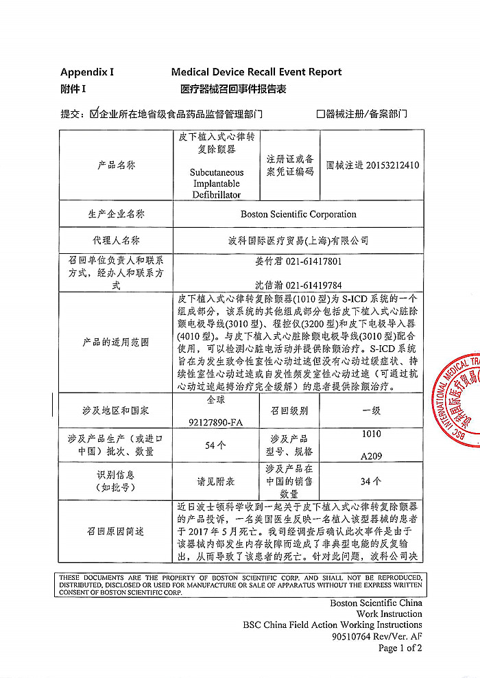 波科國際醫(yī)療貿(mào)(上海)有限公司報(bào)告,涉及產(chǎn)品器械內(nèi)部發(fā)生內(nèi)存故障造成了非典型電能的反復(fù)輸出。波科國際醫(yī)療貿(mào)(上海)有限公司對(duì)皮下植入式心律轉(zhuǎn)復(fù)除顫器(注冊(cè)號(hào):國械注進(jìn)20153212410號(hào))主動(dòng)召回。召回級(jí)別為一級(jí)。涉及產(chǎn)品的型號(hào)、規(guī)格及批次等詳細(xì)信息見《醫(yī)療器械召回事件報(bào)告表》。