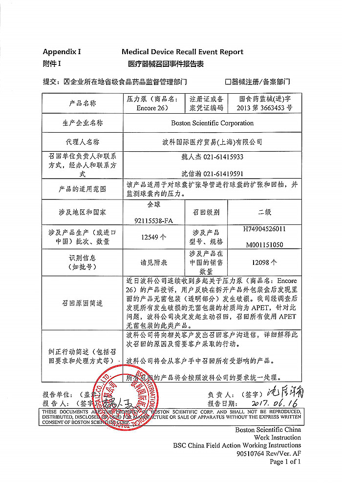 波科國際醫(yī)療貿(mào)易(上海)有限公司報(bào)告,涉及產(chǎn)品無菌包裝(透明部分)可能發(fā)生破損。波科國際醫(yī)療貿(mào)易(上海)有限公司對(duì)壓力泵(Encore26)(注冊(cè)號(hào):國食藥監(jiān)械(進(jìn))字2013第3663453號(hào))主動(dòng)召回。召回級(jí)別為二級(jí)。涉及產(chǎn)品的型號(hào)、規(guī)格及批次等詳細(xì)信息見《醫(yī)療器械召回事件報(bào)告表》。