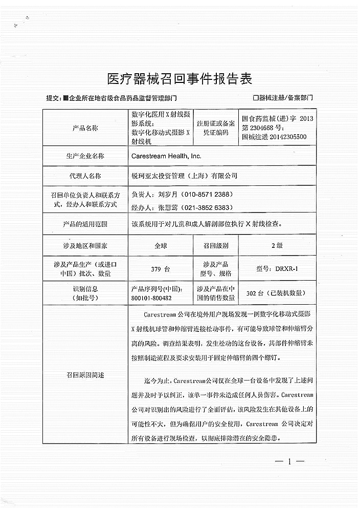 銳珂亞太投資管理(上海)有限公司對(duì)數(shù)字化醫(yī)用X射線攝影系統(tǒng)等產(chǎn)品主動(dòng)召回