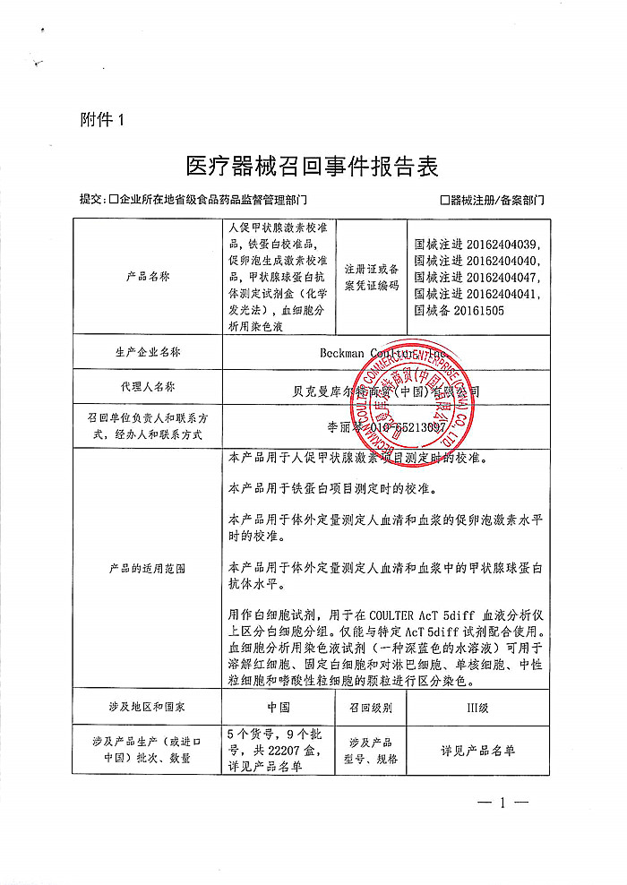 貝克曼庫爾特商貿(mào)(中國)有限公司對(duì)人促甲狀腺激素校準(zhǔn)品等產(chǎn)品主動(dòng)召回貝克曼庫爾特商貿(mào)(中國)有限公司對(duì)人促甲狀腺激素校準(zhǔn)品等產(chǎn)品主動(dòng)召回