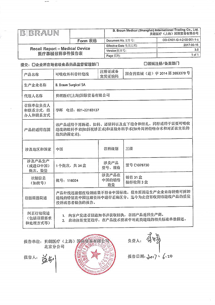 貝朗醫(yī)療(上海)國際貿(mào)易有限公司報(bào)告,涉及產(chǎn)品針線連接強(qiáng)度檢測(cè)結(jié)果不符合標(biāo)準(zhǔn)。貝朗醫(yī)療(上海)國際貿(mào)易有限公司對(duì)可吸收外科帶針縫線(注冊(cè)號(hào):國食藥監(jiān)械(進(jìn))字2014第3653379號(hào))主動(dòng)召回。召回級(jí)別為三級(jí)。涉及產(chǎn)品的型號(hào)、規(guī)格及批次等詳細(xì)信息見《醫(yī)療器械召回事件報(bào)告表》。