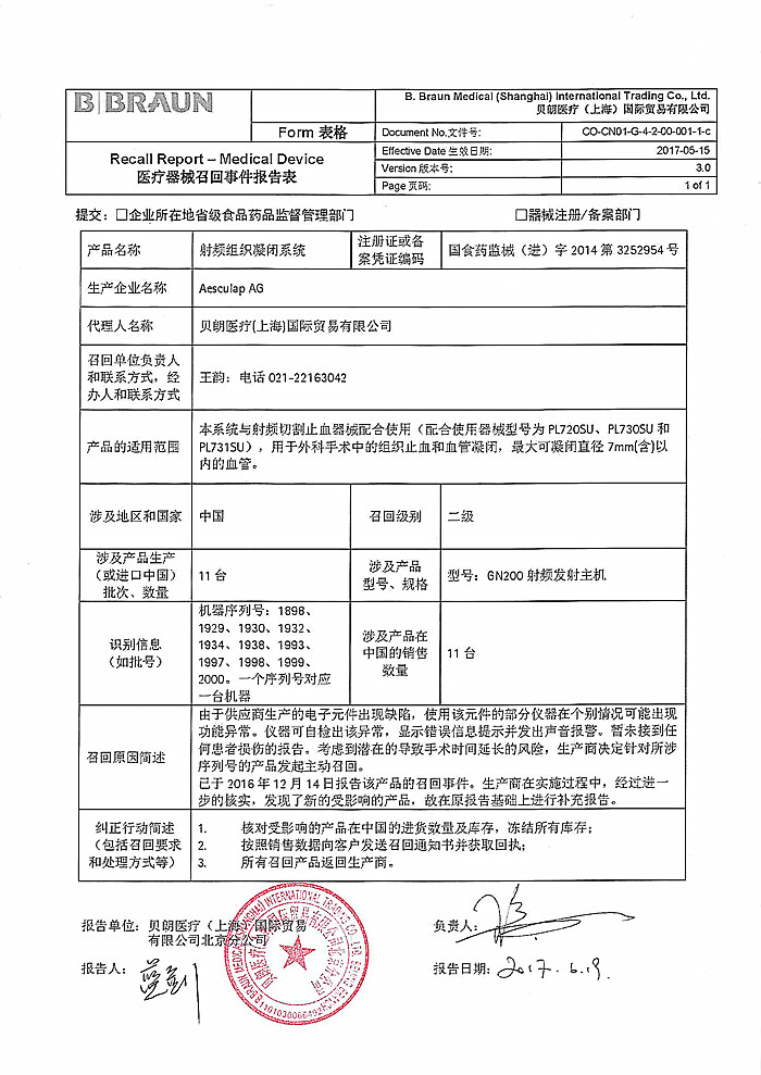 貝朗醫(yī)療(上海)國際貿(mào)易有限公司對(duì)射頻組織凝閉系統(tǒng)主動(dòng)召回