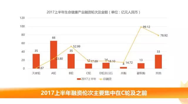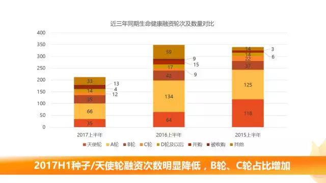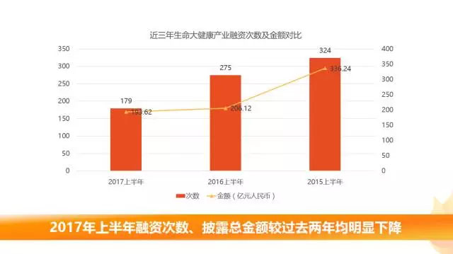 相比2016年H1的275筆融資,合計206.12億元人民幣和2015年H1的324筆、336.24億元人民幣,2017年生命大健康產(chǎn)業(yè)H1融資次數(shù)、披露金額較過去兩年均明顯下降。