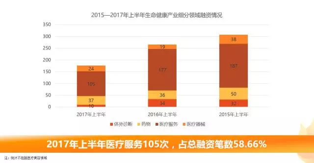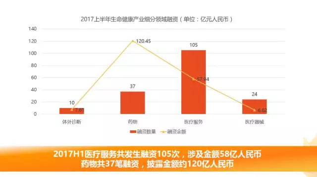 從產(chǎn)業(yè)細(xì)分領(lǐng)域融資情況來看,2017上半年醫(yī)療服務(wù)行業(yè)共發(fā)生融資105次,涉及金額約57.94億元人民幣。醫(yī)藥行業(yè)共發(fā)生37筆融資,明確披露融資金額約為120.45億元人民幣。
