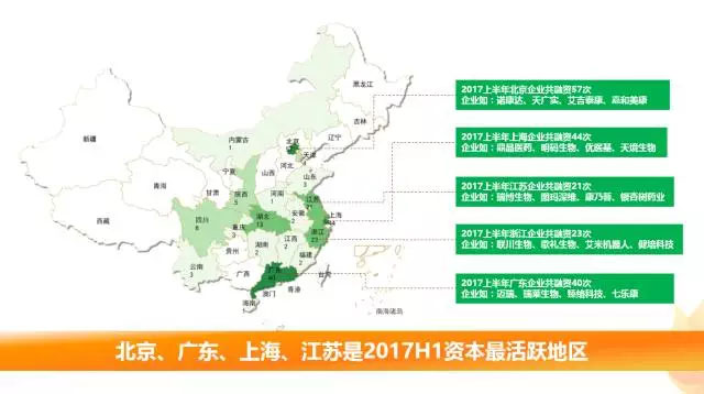 從產(chǎn)業(yè)融資的地域分布情況來看,北京、廣東、上海、浙江、江蘇是2017上半年生命大健康產(chǎn)業(yè)資本最活躍的地區(qū)。其中首都北京是融資發(fā)生最多的地方,共公開披露融資57次,涉及融資的企業(yè)如諾康達(dá)、天廣實、艾吉泰康等等;位于上海的企業(yè)共發(fā)生融資44次,相關(guān)企業(yè)主要有明碼生物、鼎晶醫(yī)藥、天境生物等;廣東披露的融資數(shù)量僅次于上海,明確披露了40起,涉及融資的企業(yè)如:衛(wèi)光生物、瑞萊生物、臻絡(luò)科技等。此外,浙江和江蘇分別披露融資數(shù)量為23筆和21筆。