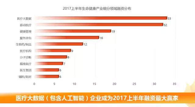 其中,醫(yī)療大數(shù)據(jù)、移動醫(yī)療、健康管理、合同外包組織、生物藥/制品是獲得融資數(shù)量排名前5的細(xì)分領(lǐng)域,其中醫(yī)療大數(shù)據(jù)(包含人工智能)的企業(yè)成為2017上半年生命健康產(chǎn)業(yè)融資的最大贏家,共有33家企業(yè)完成融資。