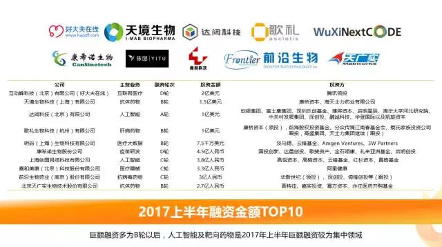 2017年上半年生命健康產(chǎn)業(yè)融資金額top10的企業(yè)主要集中在人工智能和靶向藥物領(lǐng)域,融資階段主要集中在B輪及以后,融資金額最低也在2.7億元人民幣。