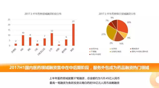 2017年H1醫(yī)藥領(lǐng)域共披露融資37筆,明確披露融資金額約為120.45億元人民幣,最高一筆融資為醫(yī)藥集團(tuán)云南白藥獲得江蘇魚躍醫(yī)療投資的56億人民幣戰(zhàn)略融資。從融資階段來看,國內(nèi)醫(yī)藥領(lǐng)域融資集中在中后期階段。