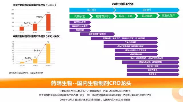 生物制劑在全球藥物市場中占據(jù)重要地位,目前市場規(guī)模保持較快增長,與之對應(yīng)的生物制劑研發(fā)服務(wù)市場亦潛力巨大,預(yù)計國內(nèi)市場規(guī)模將由2016年的21億元增長到2021年的92億元。藥明生物于5月29日宣布將正式登陸港股市場。作為國內(nèi)生物制劑CRO龍頭企業(yè),藥明生物占據(jù)全球約1.8%的市場份額,占據(jù)國內(nèi)約48%的市場份額。
