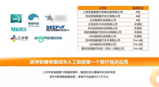 醫(yī)學(xué)影像與人工智能結(jié)合成為熱門關(guān)注領(lǐng)域,且有望成為人工智能領(lǐng)域第一個醫(yī)療臨床應(yīng)用,融資階段主要集中在項目早期,其中5筆明確披露融資金額,單筆平均金額約為3.3千萬元人民幣。