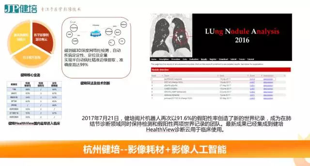 杭州健培科技有限公司致力于醫(yī)學(xué)影像大數(shù)據(jù)分析技術(shù)(MIBA)的研發(fā)及應(yīng)用,現(xiàn)已形成醫(yī)學(xué)影像輸出、智慧醫(yī)療和智能診斷為主,其他大數(shù)據(jù)支撐設(shè)備及平臺建設(shè)為輔的“智慧衛(wèi)生”生態(tài)系統(tǒng)。2017年7月21日,旗下閱片機(jī)器人再次以91.6%的假陽性率創(chuàng)在了新的世界記錄,最新成果已經(jīng)集成到健培HealthView診斷云用于臨床使用。