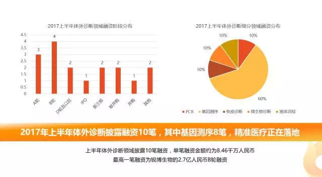 2017年H1國內(nèi)體外診斷領(lǐng)域披露融資10筆,單筆融資金額約為8.46千萬元人民幣,最高一筆融資為銳博生物的2.7億元人民幣B輪融資。