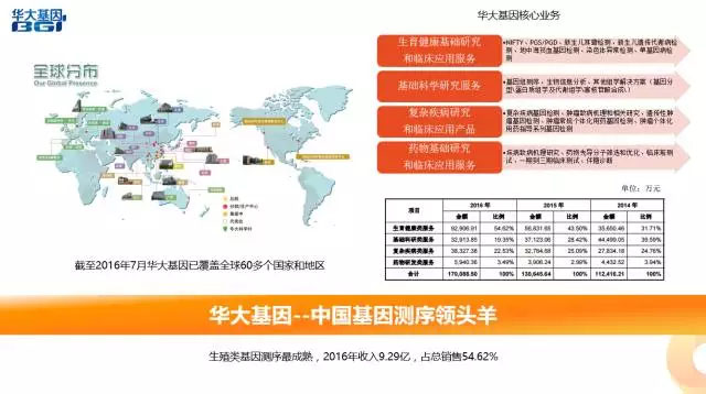 2017年7月14日,中國基因測序領(lǐng)頭羊——華大基因正式登陸深交所創(chuàng)業(yè)板,成為真正意義的基因測序行業(yè)登陸資本市場的第一股。其核心業(yè)務(wù)涉及生育健康基礎(chǔ)研究和臨床應(yīng)用服務(wù)、基礎(chǔ)科學(xué)研究服務(wù)、復(fù)雜疾病研究和臨床應(yīng)用產(chǎn)品、以及藥物基礎(chǔ)研究和臨床應(yīng)用服務(wù)。其中生殖類基因測序應(yīng)用的最為成熟,2016年收入為9.29億,占總銷售額的54.62%。