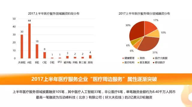 2017年H1國內(nèi)醫(yī)療服務(wù)企業(yè)“醫(yī)療周邊服務(wù)”屬性逐漸突破,領(lǐng)域內(nèi)共披露融資105筆,單筆融資金額約為8.40千萬元人民幣,最高一筆融資為互動峰科技(北京)有限公司(好大夫在線)的2億美元D輪融資。