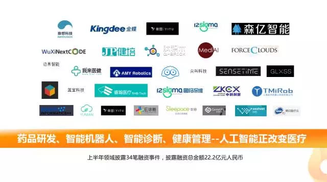 其中醫(yī)療人工智能領(lǐng)域共披露34筆融資,明確披露融資總金額約為22.2億元人民幣。人工智能在藥品研發(fā)、智能機(jī)器人、智能診斷、健康管理等方面的應(yīng)用正在潛移默化的改變醫(yī)療行業(yè)。