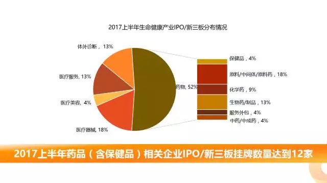 上半年生命健康產(chǎn)業(yè)共有21家公司完成IPO/新三板掛牌,其中藥品(含保健品)相關(guān)企業(yè)IPO/新三板掛牌數(shù)量達(dá)到12家。