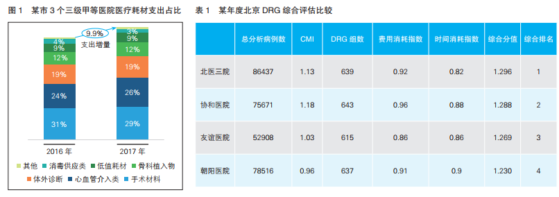 DRG的實(shí)施使藥品和醫(yī)療器械耗材從醫(yī)院的利潤中心轉(zhuǎn)變?yōu)槌杀局行?,從收入來源轉(zhuǎn)變?yōu)榭刭M(fèi)目標(biāo)。據(jù)相關(guān)研究表明,醫(yī)療耗材支出的增長幅度高于醫(yī)院收入的增長,這將導(dǎo)致醫(yī)院對(duì)耗材的控費(fèi)更為緊迫。以圖1為例,可收費(fèi)的醫(yī)療耗材的支出,如心血管介入類等占比一直在增加,而不可收費(fèi)的醫(yī)療耗材,如部分手術(shù)材料、消毒供應(yīng)類耗材的采購金額占比則呈明顯下降趨勢(shì)。
