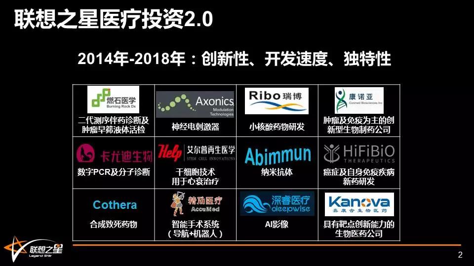 聯(lián)想之星是一家專注于早期投資的綜合基金,主要投資于人工智能、TMT、醫(yī)療健康三大領(lǐng)域,以天使輪及A輪的項(xiàng)目為主。2010年以來,我們投資了近300個項(xiàng)目,其中醫(yī)療方向50多個。我們針對醫(yī)療領(lǐng)域的投資策略,也從2013年之前考慮國內(nèi)市場容量和技術(shù)領(lǐng)先為主,演化成近5年來,更關(guān)注可被國際合作檢驗(yàn)的創(chuàng)新、有全球視野和經(jīng)驗(yàn)的創(chuàng)始人及團(tuán)隊(duì)、產(chǎn)品是否圍繞未被滿足的臨床需求(獨(dú)特性)等。