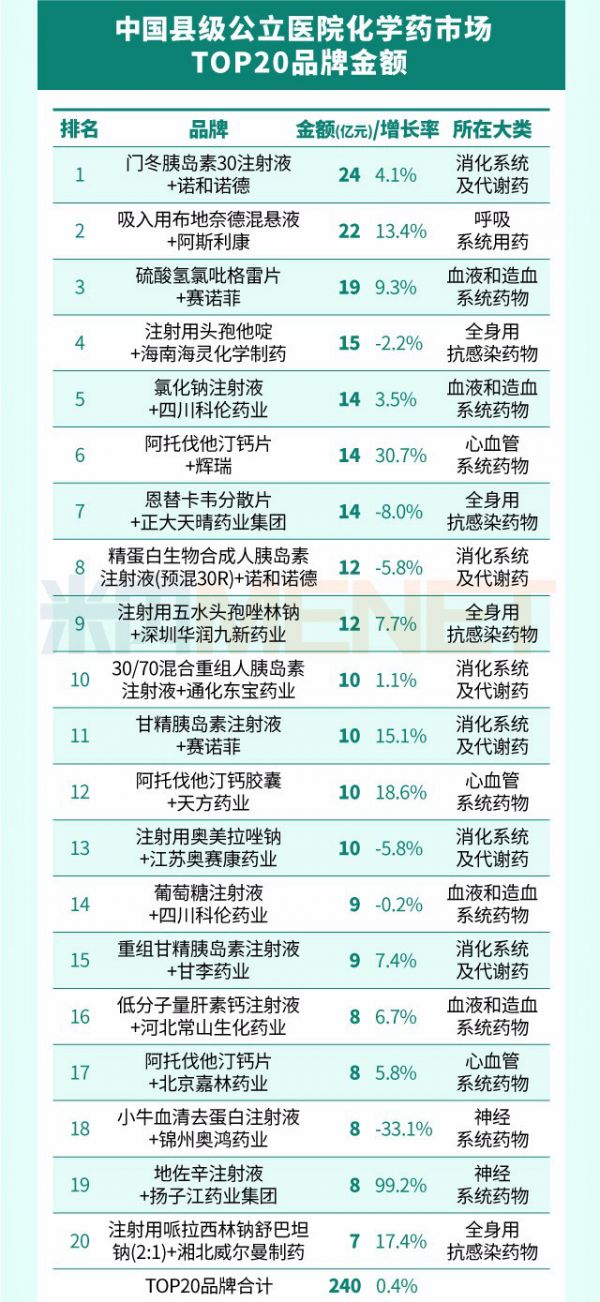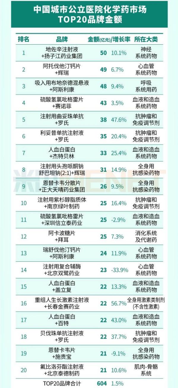 最新數(shù)據(jù),中國(guó)城市和縣級(jí)公立醫(yī)院品牌銷(xiāo)售額TOP20公布,多個(gè)大品種上榜。