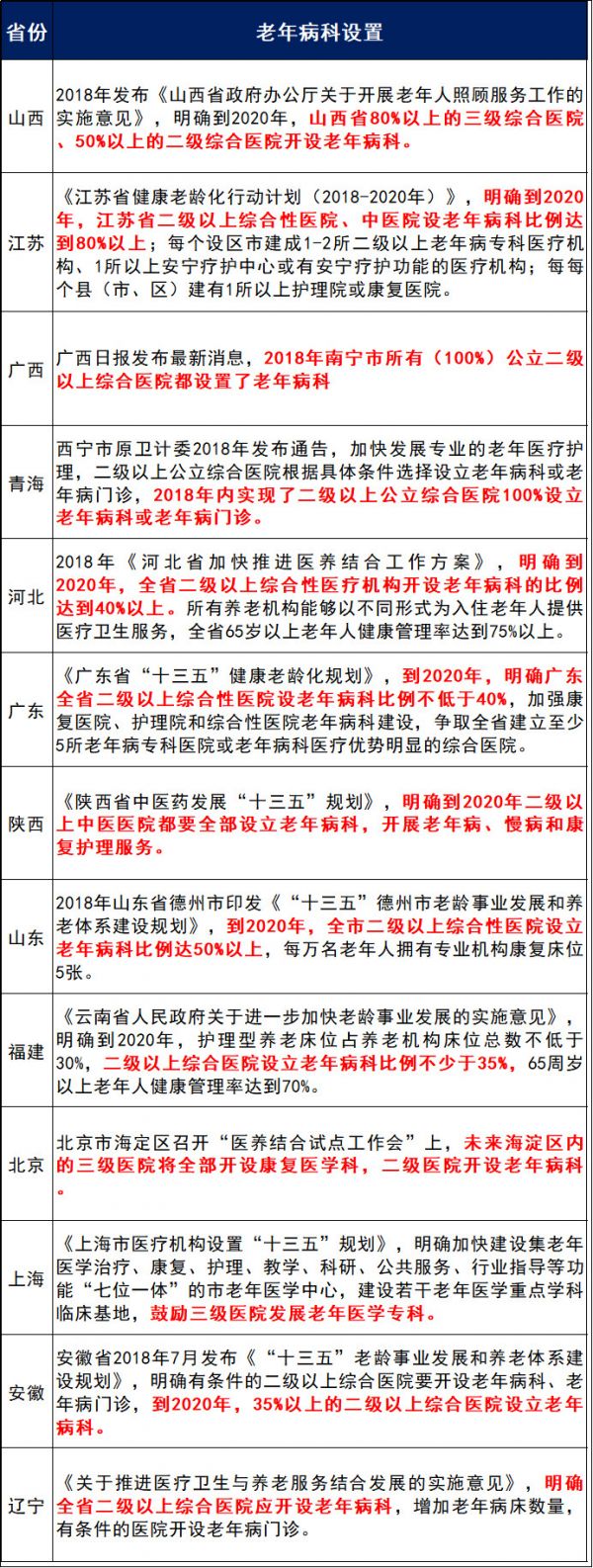隨著人口老齡化特點(diǎn)加劇,老年病人也越來(lái)越多,人們對(duì)于老年病科有巨大的需求! 國(guó)家政策出臺(tái)后,各省市也明確二級(jí)以上要設(shè)置老年病科,從各省市的的十三五規(guī)劃來(lái)看,諸多省市比國(guó)家要求的比例更高!