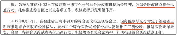 此前,在福建省三明市召開的綜合醫(yī)改推進(jìn)現(xiàn)場(chǎng)會(huì)上,國(guó)務(wù)院領(lǐng)導(dǎo)充分肯定了福建省三明市推進(jìn)綜合醫(yī)改的經(jīng)驗(yàn)做法,要求11個(gè)綜合醫(yī)改試點(diǎn)省份加快復(fù)制推廣三明經(jīng)驗(yàn),推進(jìn)醫(yī)改走深走實(shí)。