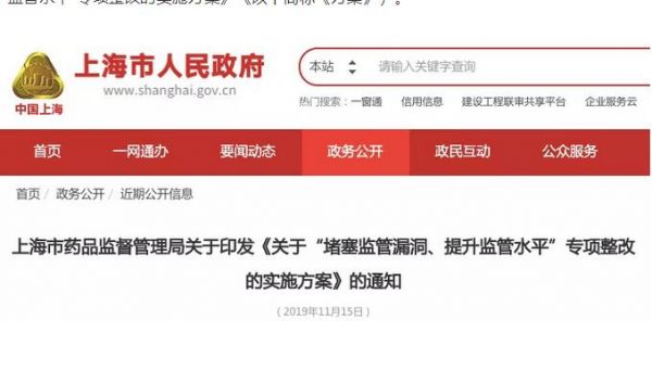 11月15日,上海市人民政府官網(wǎng)掛了一則上海市藥監(jiān)局《關(guān)于“堵塞監(jiān)管漏洞、提升監(jiān)管水平”專項(xiàng)整改的實(shí)施方案》《以下簡(jiǎn)稱《方案》)。