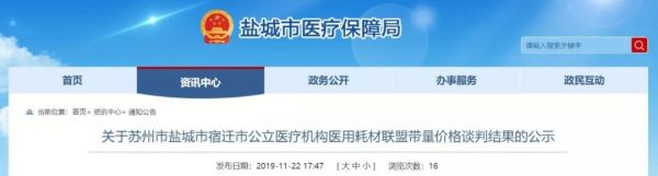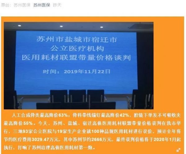 根據(jù)蘇州市醫(yī)保局和鹽城市醫(yī)保中心官微信消息,11月22日,蘇州市、鹽城市、宿遷市公立醫(yī)療機構耗材聯(lián)盟帶量價格談判在蘇州市公共資源交易中心進行,打響了蘇州治理高值醫(yī)用耗材第一槍。