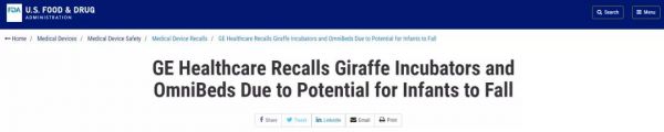 根據(jù)FDA官網(wǎng)信息,GEHealthcare召回可能會(huì)導(dǎo)致嬰兒跌倒的長(zhǎng)頸鹿培養(yǎng)箱和多功能床,召回級(jí)別為一級(jí),在美國(guó)召回的設(shè)備數(shù)量為22961件。