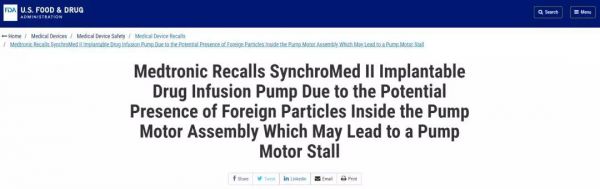 根據(jù)FDA官網(wǎng)信息,美敦力(Medtronic)召回SynchroMed II植入式輸液泵,原因是在泵馬達(dá)組件內(nèi)部可能存在異物,可能導(dǎo)致泵馬達(dá)停轉(zhuǎn),召回級(jí)別為一級(jí),在美國(guó)被召回的設(shè)備數(shù)量是7,317件。