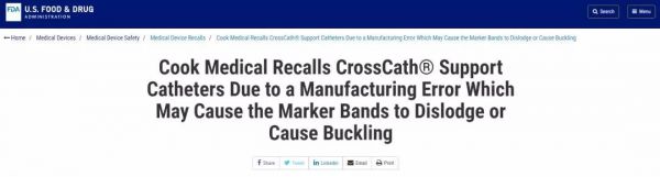 根據(jù)FDA官網(wǎng)信息,,由于生產(chǎn)錯(cuò)誤,CookMedical召回了CrossCath®支撐導(dǎo)管,該導(dǎo)管可能會(huì)導(dǎo)致標(biāo)記帶脫落或彎曲,召回級(jí)別為一級(jí),在美國(guó)被召回的設(shè)備數(shù)量是117件。