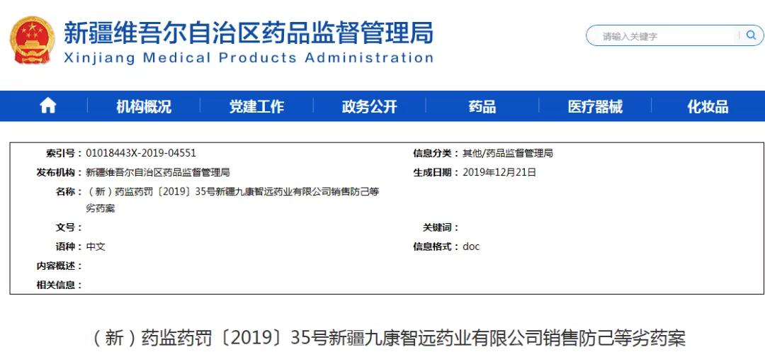 12月21日,新疆藥監(jiān)局也發(fā)布一則行政處罰通告,新疆九康智遠藥業(yè)有限公司銷售防己等劣藥被罰。