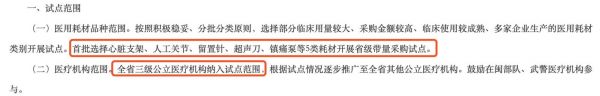 在試點(diǎn)范圍上:將首批選擇心臟支架、人工關(guān)節(jié)、留置針、超聲刀、鎮(zhèn)痛泵等5類耗材開展省級帶量采購試點(diǎn)。