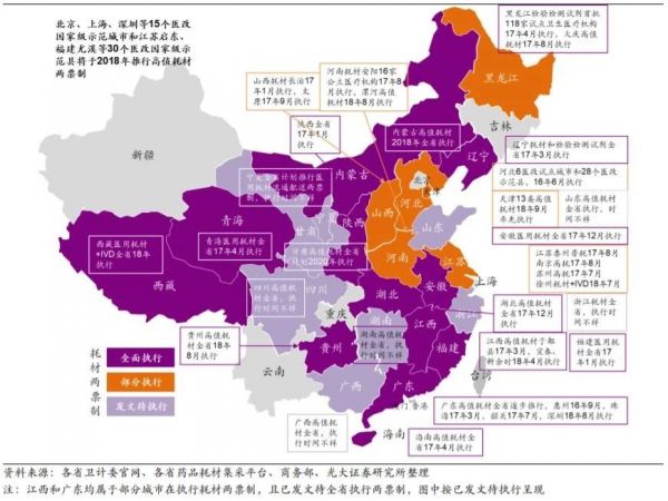 據(jù)光大證券梳理了全國耗材兩票制和耗材零加成的進(jìn)展情況,根據(jù)光大證券信息,全國多省已開始或全面實施耗材兩票制。