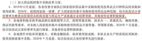 2020年,按照國家統(tǒng)一部署,擴(kuò)大國家組織集中采購和使用藥品品種范圍。綜合醫(yī)改試點(diǎn)省份要率先推進(jìn)由醫(yī)保經(jīng)辦機(jī)構(gòu)直接與藥品生產(chǎn)或流通企業(yè)結(jié)算貨款,其他省份也要積極探索。
