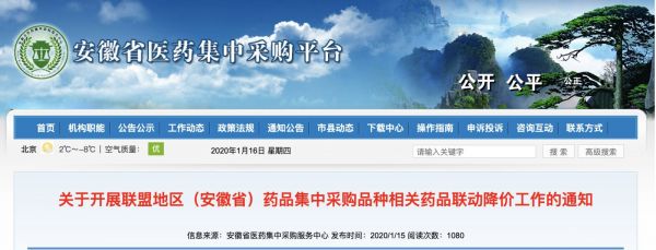 1月15日,安徽省發(fā)布文件《關(guān)于開展聯(lián)盟地區(qū)(安徽?。┧幤芳胁少徠贩N相關(guān)藥品聯(lián)動降價工作的通知》,311個品種將自主申報降價,未按規(guī)定申報降價的,將被取消掛網(wǎng)資格。