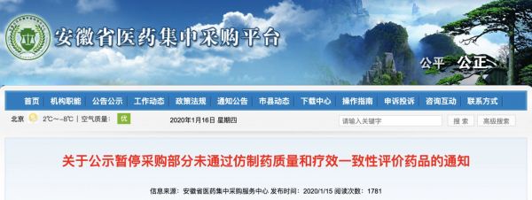賽柏藍(lán)了解到,根據(jù)《安徽省落實國家組織藥品集中采購和使用試點(diǎn)擴(kuò)圍工作實施方案》等文件要求,與中選藥品同品種藥品通過一致性評價的生產(chǎn)企業(yè)達(dá)到3家以上的,在確保供應(yīng)的情況下,藥品集中采購中不再選用未通過一致性評價的品種,現(xiàn)對部分未通過仿制藥質(zhì)量和療效一致性評價藥品暫停掛網(wǎng)采購。